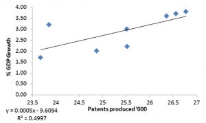 The invention index is an equation based on the correlation between patent production growth rate and GDP growth. It serves as a critical metric to track a country’s (or state’s) success in recovering from an economic recession.