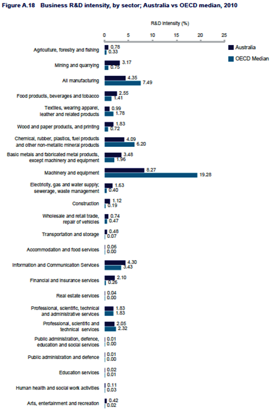 According to the report, levels of new to market innovation have dropped in the last ten years. Despite this, Australian rates of business creation are in the top five by world standards. Through a survey it was established that Australian businesses nominated a lack of funding as the main barrier to innovation, which is also reflected in the lack of investment into innovation in Australia. A worrying statistic found in the report explained that of the 2 million businesses in Australia, only 9,000 undertake R&D. Australia spends 1.23% of GDP on R&D, most of which is concentrated in primary and mining industries, which places it in 15th place out of the 34 OECD countries. Australia’s R&D investment in high tech manufacturing, however, is well below average, shown in the figure below.